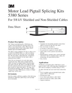 Product Description: 3M™ Motor Lead Pigtail Splicing Kits 5380 Series are designed for splicing motor lead cables to incoming feeder cables. These kits are removable and reusable. These kits can accommodate pigtail (stub) connections, 5/8 kV shielded and non-shielded feeders. The splice’s main component, the slip-on splice cover, is made from EPDM rubber. Mastic is used for the moisture seal on the pigtail kits. The kits utilize a high dielectric constant (K) stress control termination for the feeder cable’s electrical stress control. These kits are designed to be used with copper compression lugs. After being crimped onto the cables, the lugs are bolted together, then insulated and sealed with the 3M Motor Lead Splicing Kits. Each kit contains all the necessary materials (except lugs) needed to make three splices. The lugs must be purchased separately. 3M™ Scotchlock™ Copper Compression Lugs 30000 Series, or other UL listed copper lugs, can be used. Kit contents include: • (3) Lug covers • (3) Cold Shrink terminations • (12) Mastic sealing strips • (3) Copper tape strips • (3) Cleaning kits • (6) Tubes of silicone grease • (3) Cold Shrink jacket tubes • (3) Constant force springs • (3) Cable ties • (3) Ground straps • (1) Instruction sheet