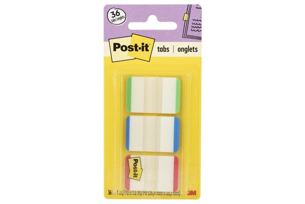 Post-it® Tabs in 1 inch size create necessary order by easily organizing planners and calendars into sections. Lined color bars give you flexibility to organize by color. Tabs are durable, you can write on them, and reposition as needed. They are also great for files, binders and notebooks. Tabs stick securely and remove cleanly. Green, Blue and Red. Contains 12 tabs/color and 36 tabs/on the go dispenser.