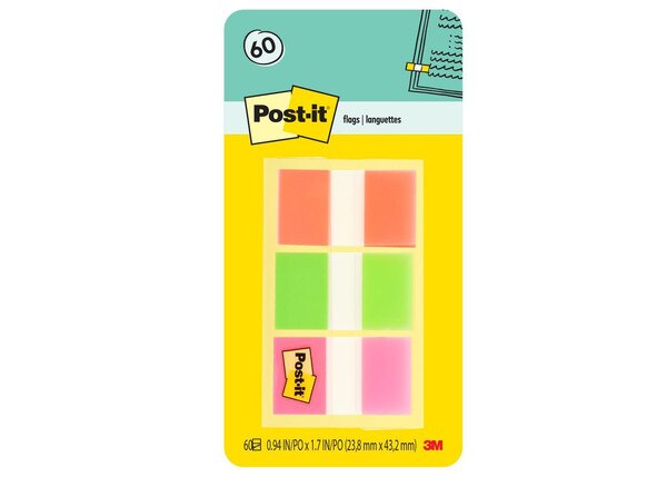 Product Description: Post-it® Flags 680-OLP with Bright Orange, Lime, and Pink Flags, .94 in. X 1.7 in. 60 Total Flags in convenient on-the-go dispenser