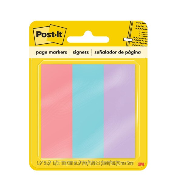 Post-it® Page Markers in assorted primary colors are eye-catching to keep important information noticed. In a large 7/8 in. x 2 7/8 in. size, Page Markers make it simple to mark, flag or highlight important information for future reference. They stick securely and remove cleanly so they are able to quickly reposition. You can highlight information on documents and keep critical notes. Contains 50 sheets/pad and 3 pads/pack.